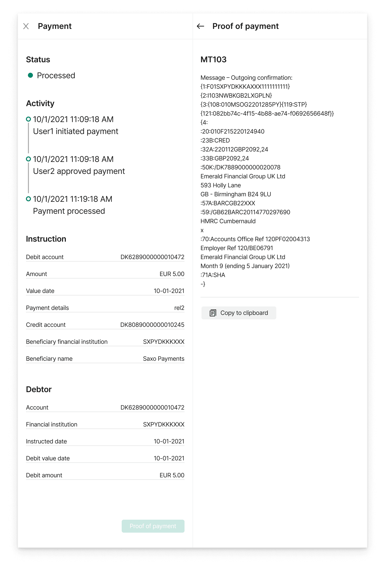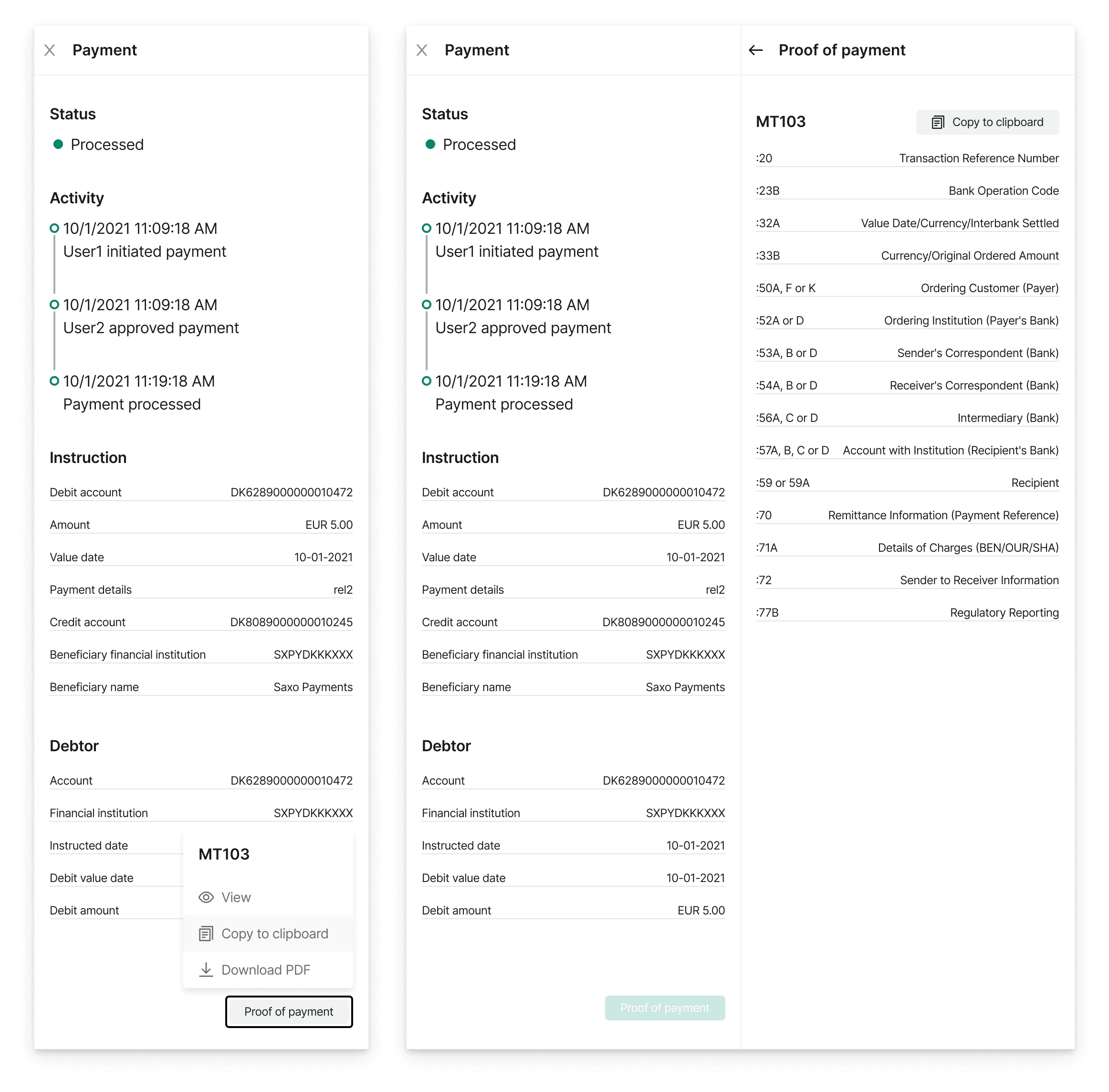 Our platform uses a sidebar to show payment details, so my idea was to place a button there, where a user could then view, copy to clipboard or download a pdf version of the MT103 payment confirmation. Also at this time, I was calling it Proof of payment, which together with some other ideas for displaying it got changed after a round of internal feedback.