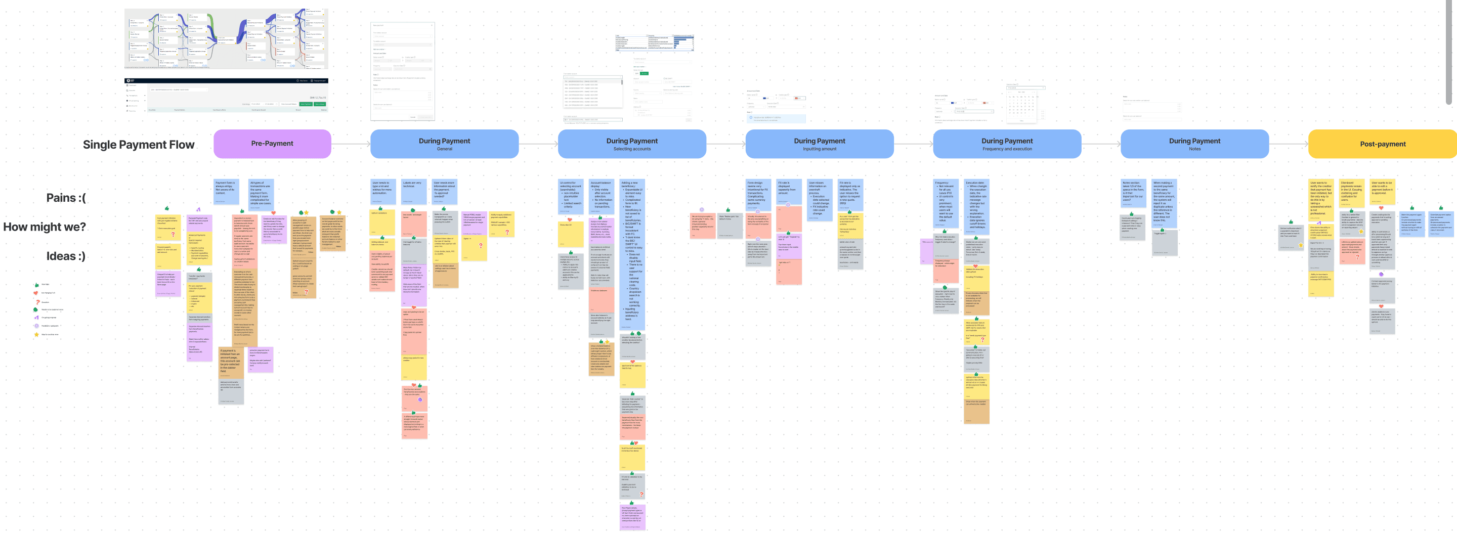 I also broke down the user flow into its three main stages (pre-payment, during payment, and post-payment) and grouped all of our discovered problems into each of these sections.