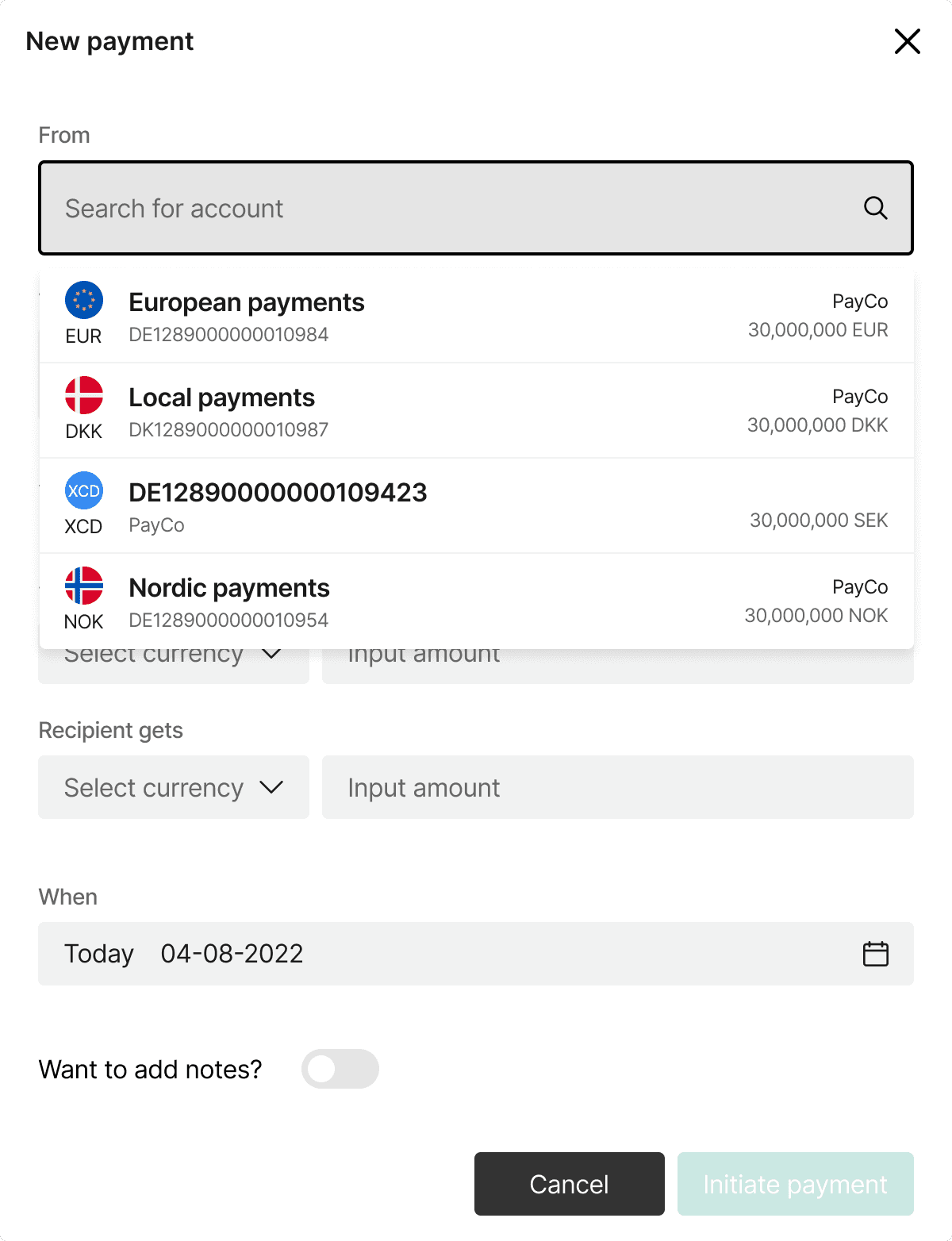 Selecting accounts is complicated, the user only has the IBAN and currency of an account, and this information is not enough for some users.