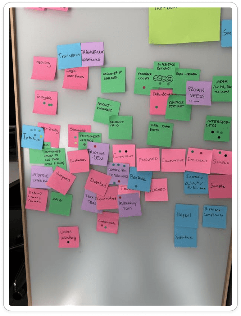 Through dot voting, we selected the most resonant attributes and, in pairs, crafted draft vision statements.
